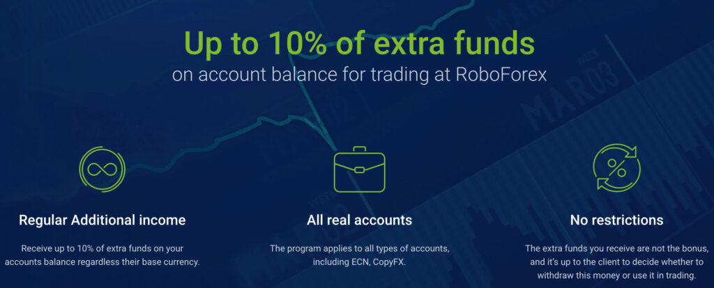 RoboForex offers a trading volume bonus but after digging into the terms 10% is only available if you trade more than 1,000 lots